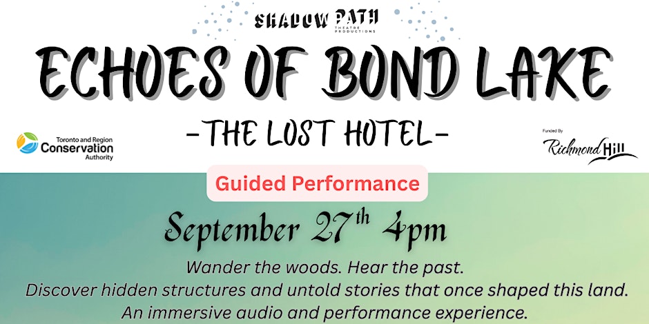 Shadow Path Theatre presents an opportunity to wander the woods, hear the past and discover hidden structures and untold stories that once shaped this land. This is an immersive audio performance at Bond Lake Park on September 27, 2025 at 4 pm (rain date Sunday, September 28, 2025 at 4 pm).